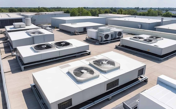 One of more inverter-controlled outdoor heat pump units can provide heating, cooling and domestic hot water to an apartment building, with 1 outdoor unit combined with up to 10 indoor units. Outdoor units between 23 and 45kW extract the heat from the outdoor air, raise it to an intermediate temperature and transfer this heat energy to the individual indoor units.